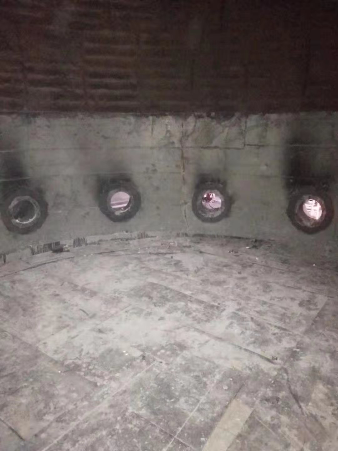 本次工程自2019年10月26日開始,包括爐底、爐缸、風口區(qū)澆注及爐身噴涂等。因高爐內(nèi)部侵蝕嚴重,高爐爐底僅保留兩層碳磚,精冶源在此基礎(chǔ)上采用具有優(yōu)良親和性能的塑性相碳磚澆注料整體澆注,與舊有碳磚形成有機整體。爐缸部分無碳磚無縫緊貼冷卻壁整體澆注,整個爐底爐缸部分建立了完整高效的傳熱體系。